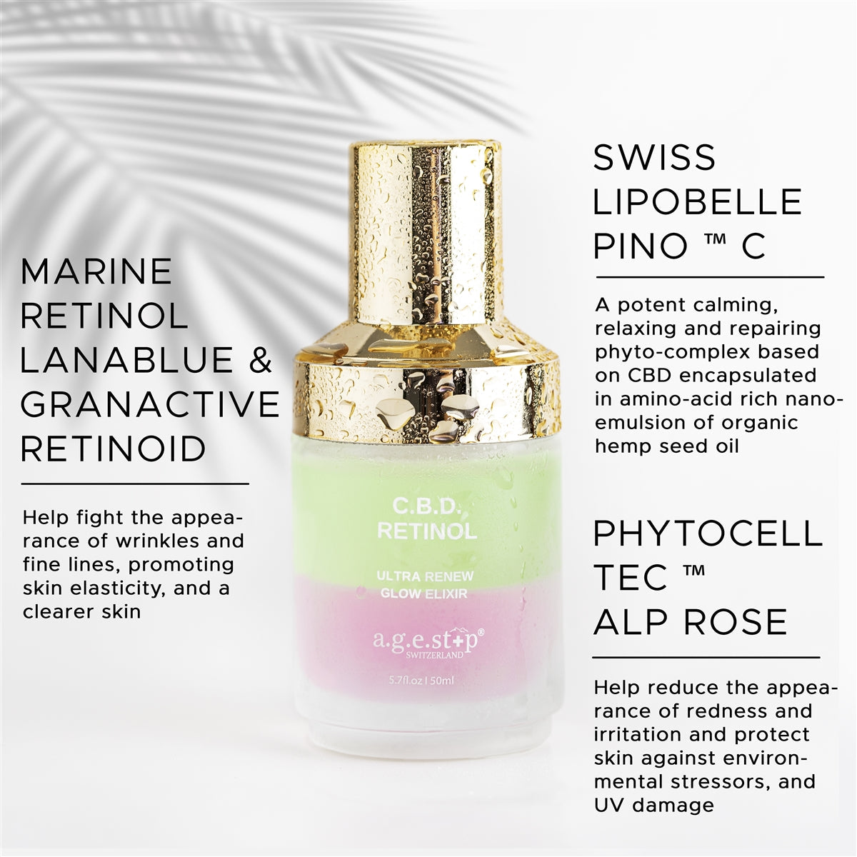 C.B.D/RETINOL is a powerful hydrating and soothing double phase anti-aging concentrate, which utilizes the power of Swiss Lipobelle™ Pino C – a potent calming, relaxing and repairing phyto-complex based on CBD encapsulated in amino-acid rich nano-emulsion of organic hemp seed oil. Swiss stone pine extract which works to provide strong calming, relaxing and anti-inflammatory effect, whilst improving skin tone and texture.