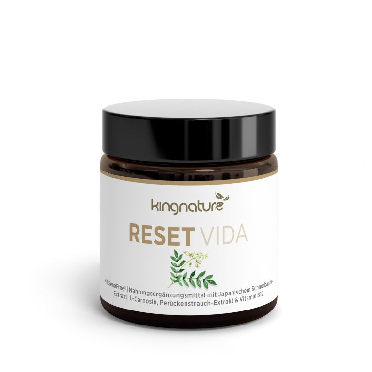 Reset Vida contains the unique, patented and scientifically proven nutrient mix SenoFree®. This combination of specifically selected plant substances includes extracts from the flowers of the Japanese pagoda tree and the leaves of the Eurasian smoketree, various herbs, carnosine, sunflower lecithin, oatmeal and vitamin B12 in the bioactive form methylcobalamin.