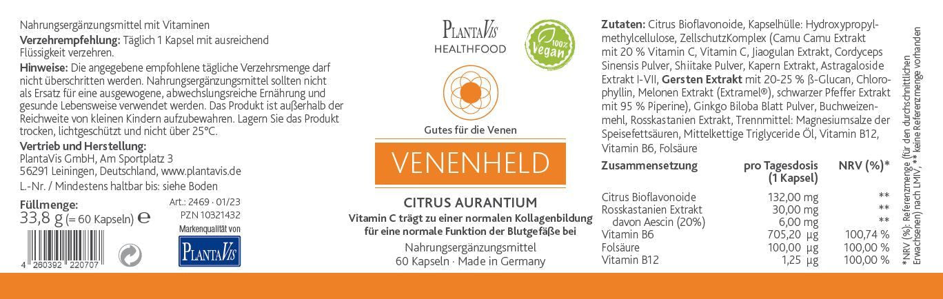 “Good for the veins” VenenHeld contains citrus extract, which consists of 50% bioflavonoids, supplemented by vitamin B6, folic acid, vitamin B12, vitamin C and the exclusive cell protection complex from PlantaVis.