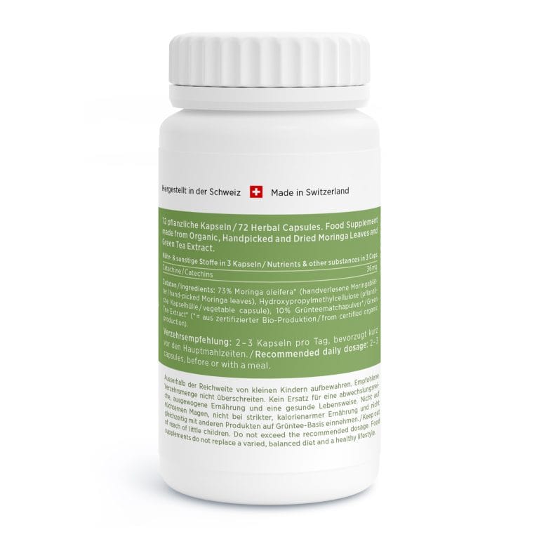 Moringa Vida contains 72 capsules, each containing 500 mg organic Moringa leaf powder (Moringa oleifera powder) and 70 mg organic green tea matcha powder. Each capsule contains 12 mg catechins from organic matcha powder. Net content 48 g.