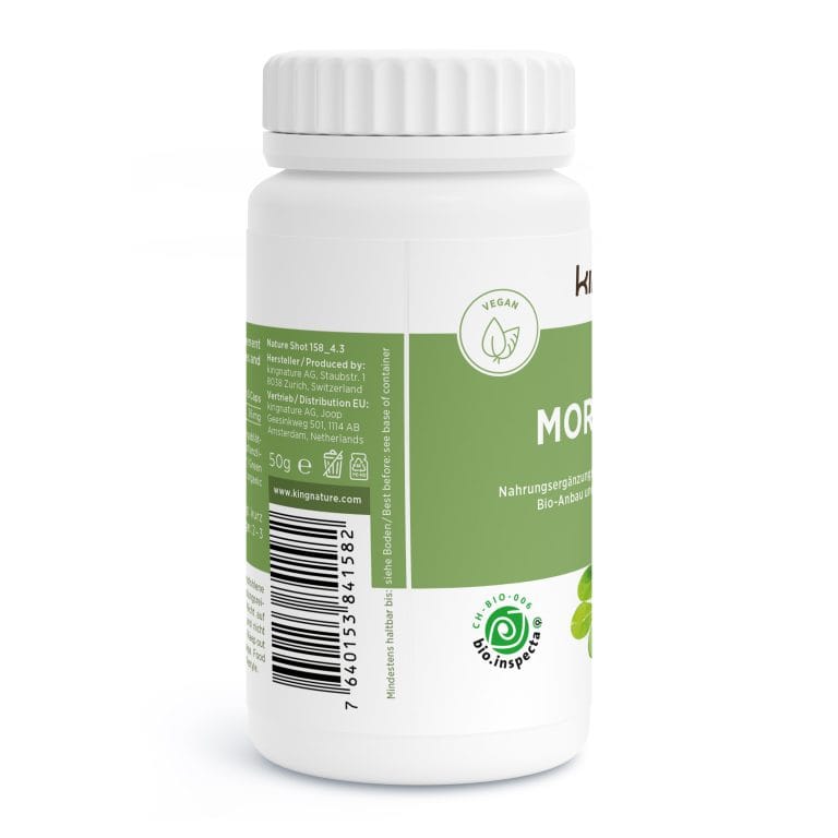Organic Moringa leaf powder and organic green tea matcha powder from certified production. 72 capsules each containing 500 mg organic moringa leaf powder (Moringa oleifera) and 70 mg organic green tea extract (Organic Matcha from Japan). With 12 mg catechins per capsule. Net content 48 g. We check each delivery of our Moringa leaf powder for microbiological impurities before processing.