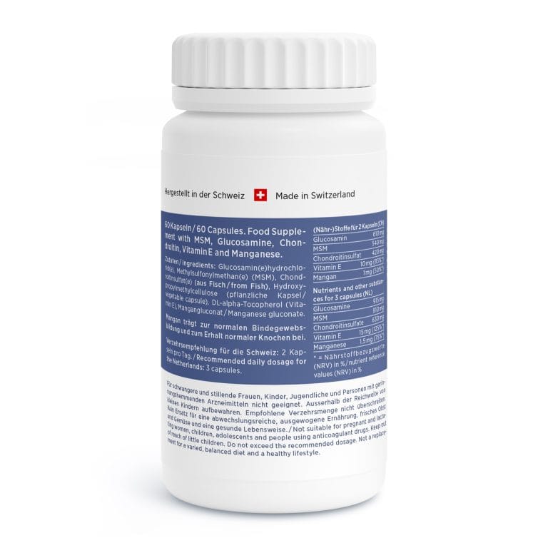 Unit price perMSM capsules with organic sulfur MSM, glucosamine and chondroitin. Manganese contributes to normal connective tissue formation and maintenance of normal bones. 60 capsules each containing 270 mg MSM, 305 mg glucosamine, 210 mg chondroitin sulfate (from fish), 0.5 mg manganese and 5 mg vitamin E. Net content: 57 g.