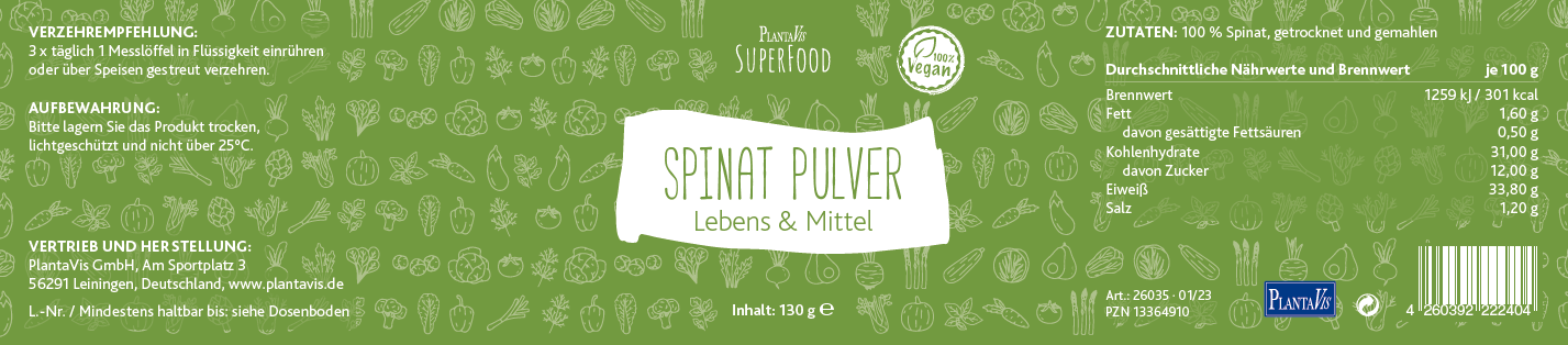 What makes our spinach powder special: through the removal of water during drying, micronutrients and secondary plant compounds are highly concentrated. We maintain the highest quality standards: we use only fresh, purely natural vegetables, gently dried and finely ground without additives or separating agents. The result is a product rich in minerals and nutrients – naturally vegan, lactose- and gluten-free.