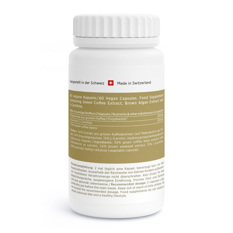 Unit price perGreen Coffee Extract: An extract of green coffee beans in capsules. 60 capsules, net content 36 g. One capsule contains 200 mg green coffee extract, 200 mg brown algae powder and 100 mg L-carnitine. Coffea Vida contains a carefully produced extract of pure green coffee beans as well as brown algae powder and L-carnitine. Coffea Vida contains no caffeine, cafestol or kahweol.