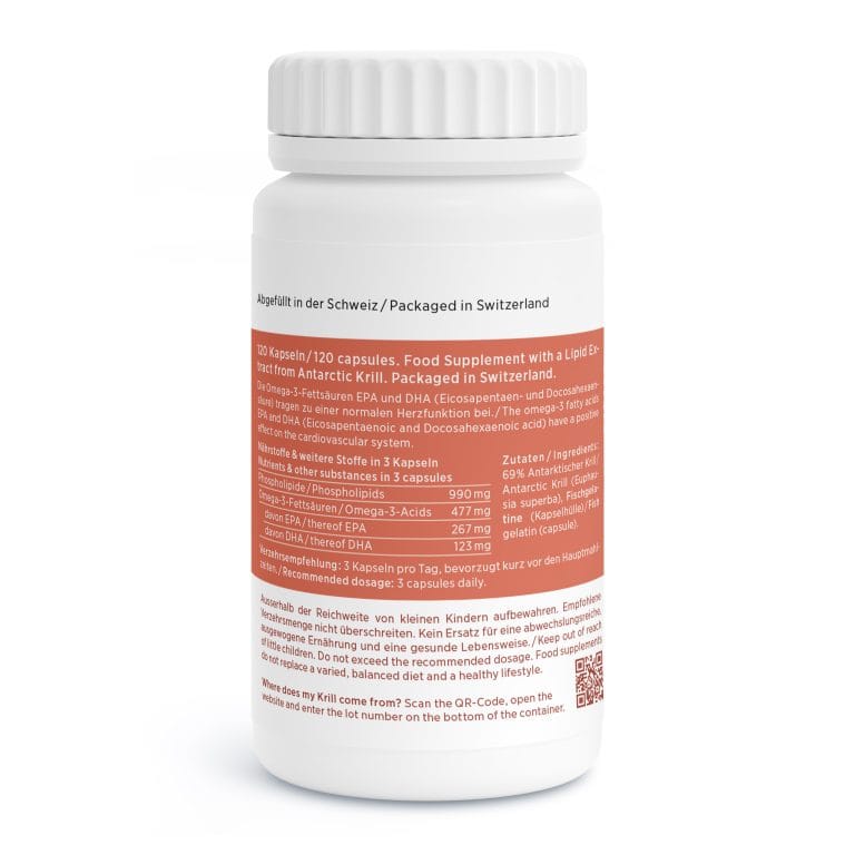 Good for your heart: the omega-3 fatty acids EPA and DHA contribute to normal heart function. 120 capsules with 590 mg of pure krill oil from sustainable catch. One capsule contains 159 mg omega-3 fatty acids, of which 89 mg EPA and 41 mg DHA. Net content 97 g.