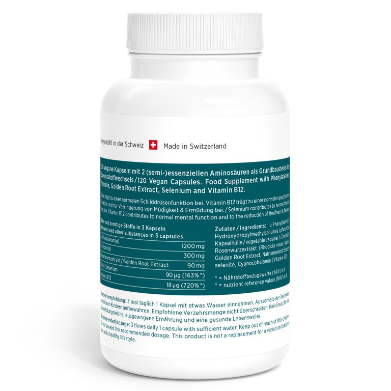 Supports the normal function of the thyroid gland, contributes to the reduction of tiredness and fatigue and to normal mental function. 120 capsules each containing 400 mg phenylalanine, 100 mg tyrosine, 30 mg roseroot, 30 µg selenium and 10 µg vitamin B12. Net content 76 g.